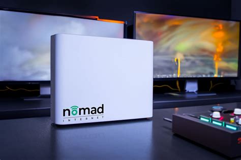 Image of a Nomad Internet router with the text “Nomad Internet” on the front